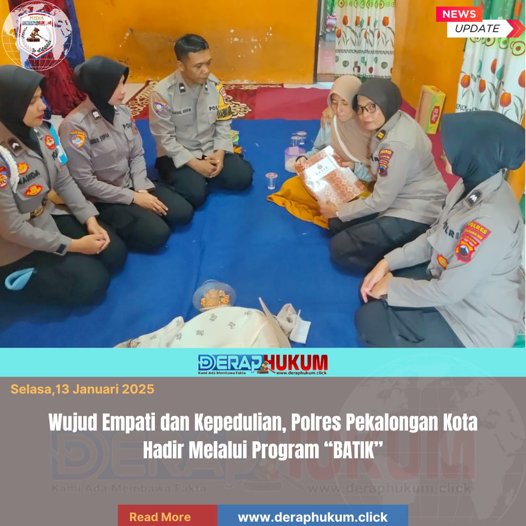 Pekalongan Kota, | Deraphukum.click | Polres Pekalongan Kota – Polda Jateng – Kepedulian terhadap warga yang tertimpa musibah kembali ditunjukkan Polres Pekalongan Kota melalui Program BATIK (Bersama Amanah Tumbuhkan Infak Kamtibmas). Kali ini, jajaran Polisi Wanita (Polwan) Polres Pekalongan Kota menyalurkan bantuan donasi kepada keluarga almarhum M. Sanjaya Putra (9), korban meninggal dunia akibat tenggelam di kolam renang.