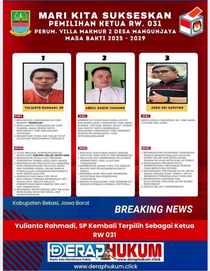 KABUPATEN BEKASI | Deraphukum.click | Minggu 22 Desember 2024. Pemilihan Ketua RW 031 Perum Villamakmur 2, Desa Mangunjaya, Kabupaten Bekasi, yang digelar pada akhir pekan lalu, berjalan dengan lancar dan penuh semangat. Tiga calon bersaing dalam pemilihan, yaitu :